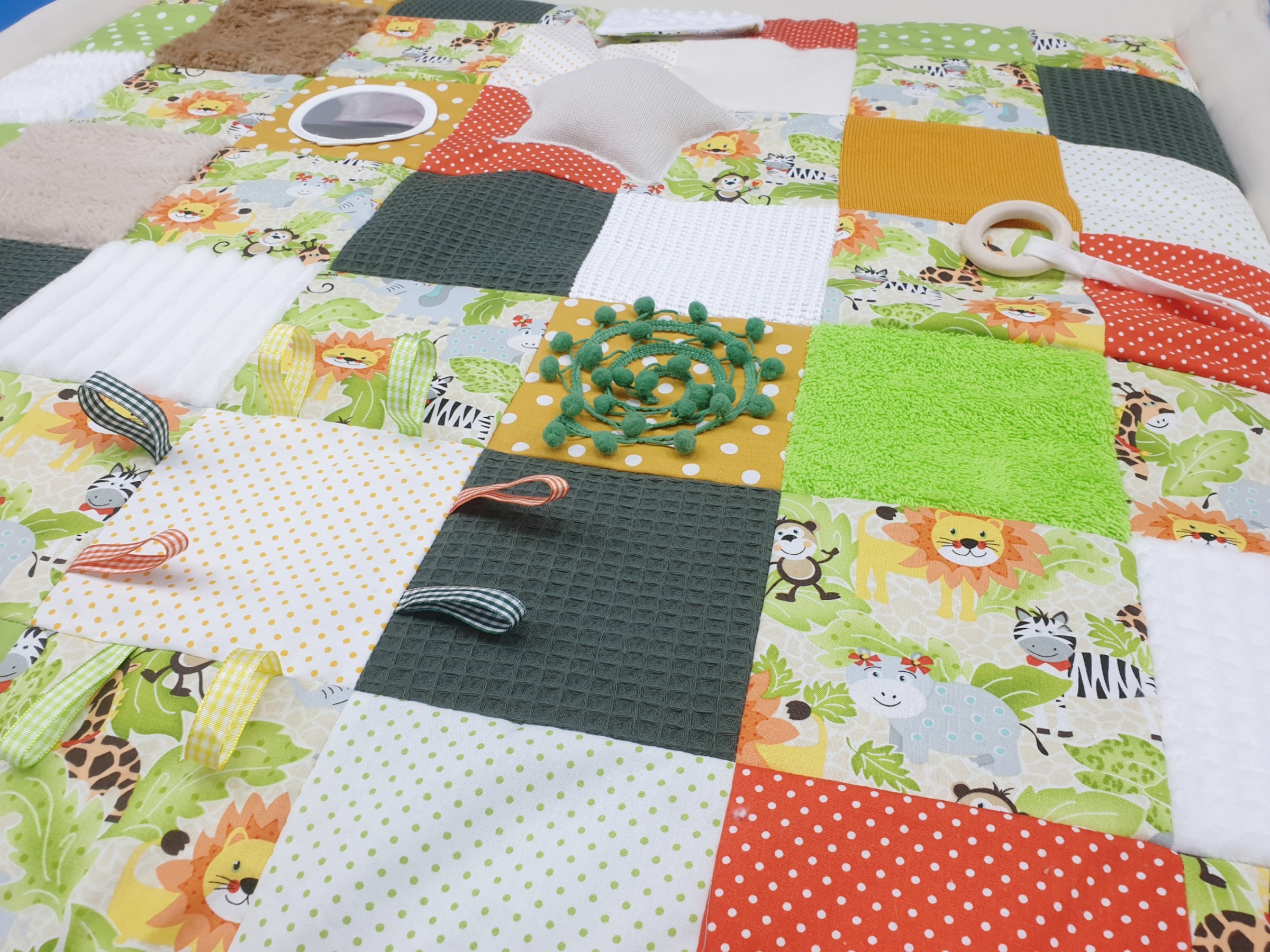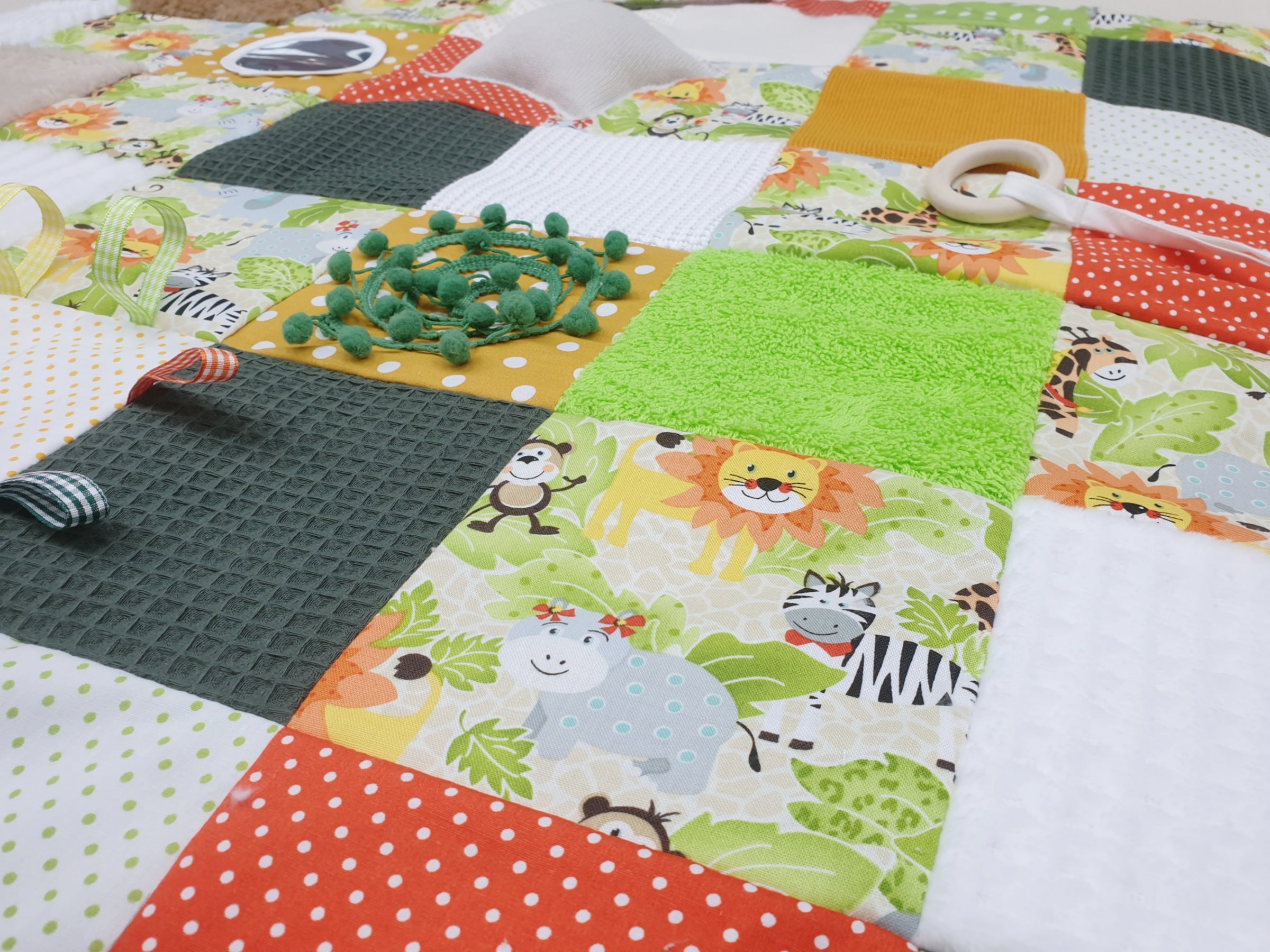 Mit dabei ist bei der normalen Erlebnisdecke viele bunte Farben gern auch mit Wunschstoffen (www.schwanger.name), verschiedene Fühlfelder wie zB. Cord, Plüsch, Strick ect., Knisterfeld, Bändchen mit Beißring (kann abgemacht werden und etwas anderes angebracht werden), Rassel, Quietscher, Zupfbändchen Feld, Holzring, Klettfeld. Durch die dicke Wattierung ist sie ideal für den Boden geeignet.